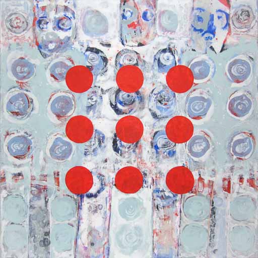Aus der Reihe Drei_red dots_weiß-grün, Acryl, Ölkreide, Lackstift, Leinwand, 80 x 80, 2015 Drei_red dots_weiß-grün, Acryl, Ölkreide, Lackstift, Leinwand, 80 x 80, 2015, 2015